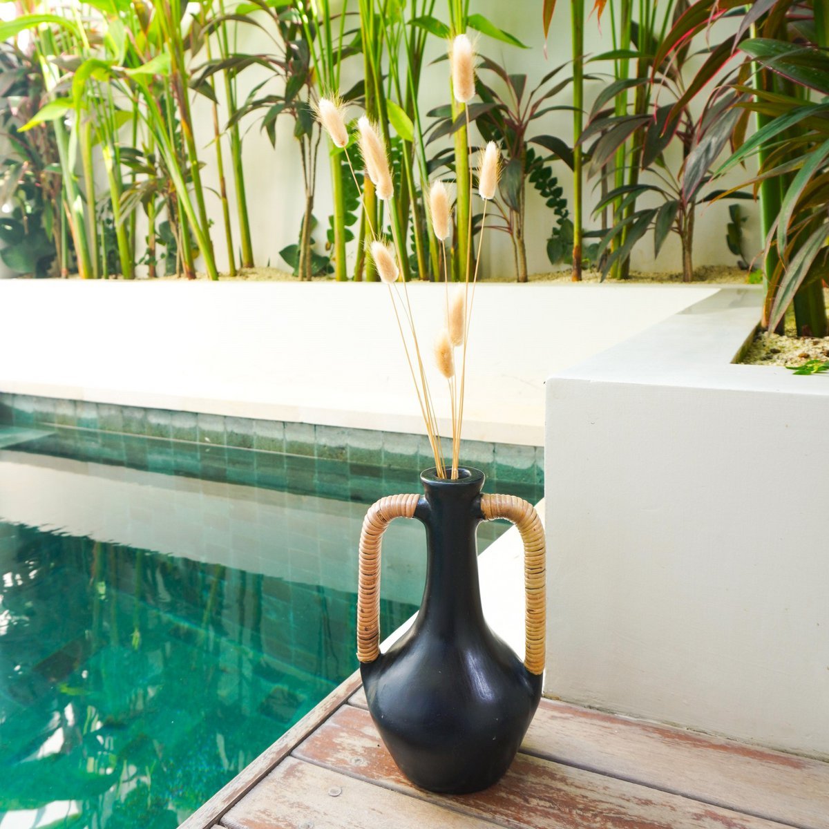 De Aya vaas combineert traditioneel vakmanschap met modern design. Met zijn elegante flesvorm, diepzwarte kleur en subtiele handvaten gewikkeld in rotanvezels is deze vaas een echte blikvanger in elk interieur. Een stijlvolle keuze voor wie houdt van natuurlijke materialen, handwerk en tijdloze esthetiek.