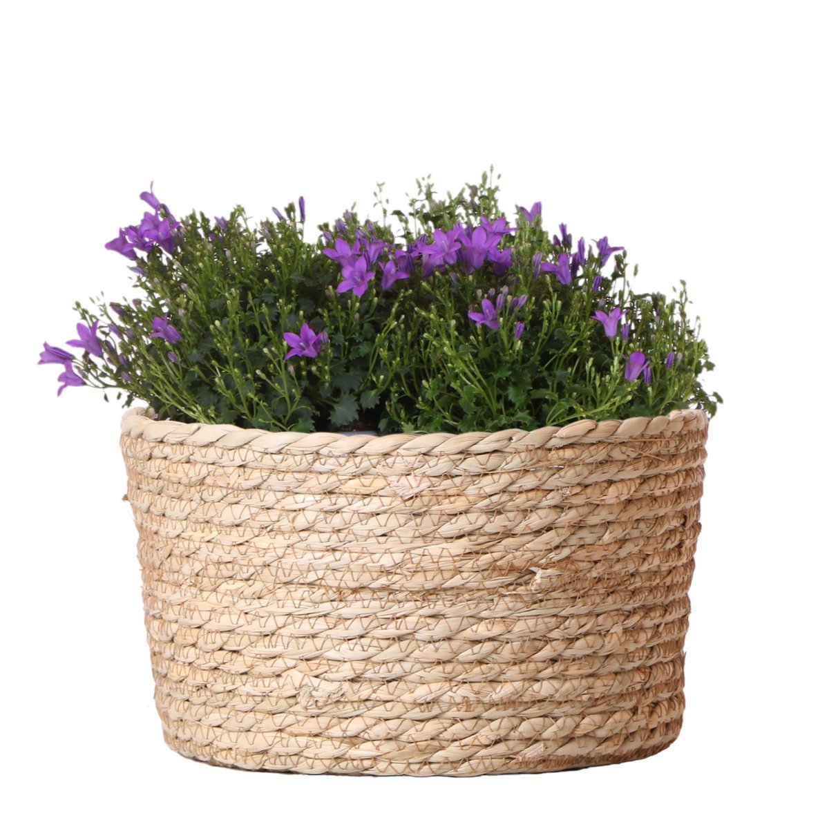 De rieten Reedbasket is handgemaakt van natuurlijk materiaal, wat elke mand uniek maakt. Het gedetailleerde vlechtwerk geeft een stoer en natuurlijk accent aan het geheel. De uitbundige klokjesbloemen (Campanula) zorgen voor een vrolijk kleuraccent in je woonkamer, tuinkamer of op je terras.