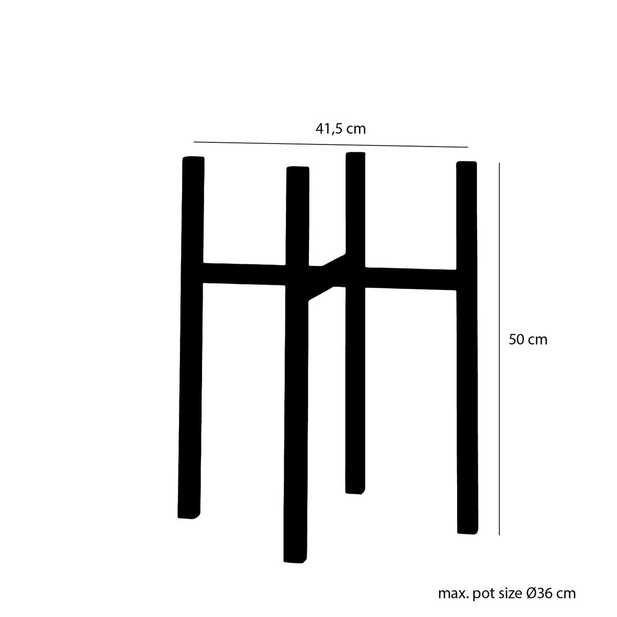 De afmetingen van deze standaard zijn L41,5 x B41,5 x H50 cm, en hij is geschikt voor een bloempot met een diameter van maximaal 36 cm.