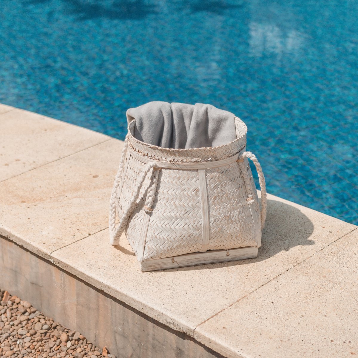 Materiaal: Bamboe (mand), zeegras (handgrepen)