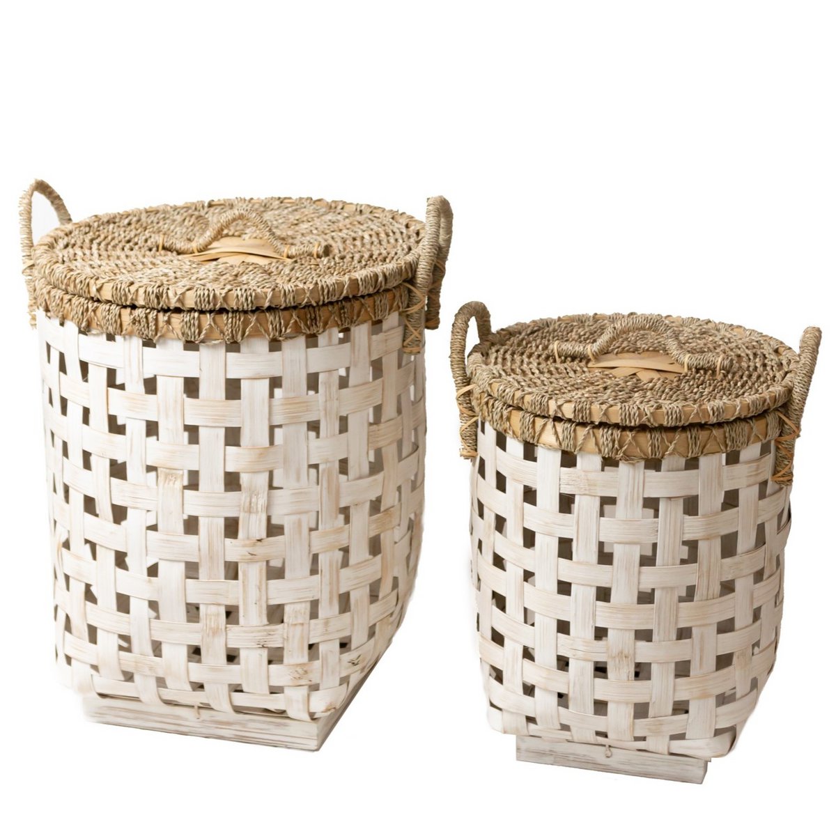 Een praktische dekselmand van witte bamboe in twee verschillende maten - dat is onze . De moderne lichtkleur past bijzonder goed bij woonstijlen met veel licht hout en textieldecoraties zoals wandkleden, kussens en dekens.