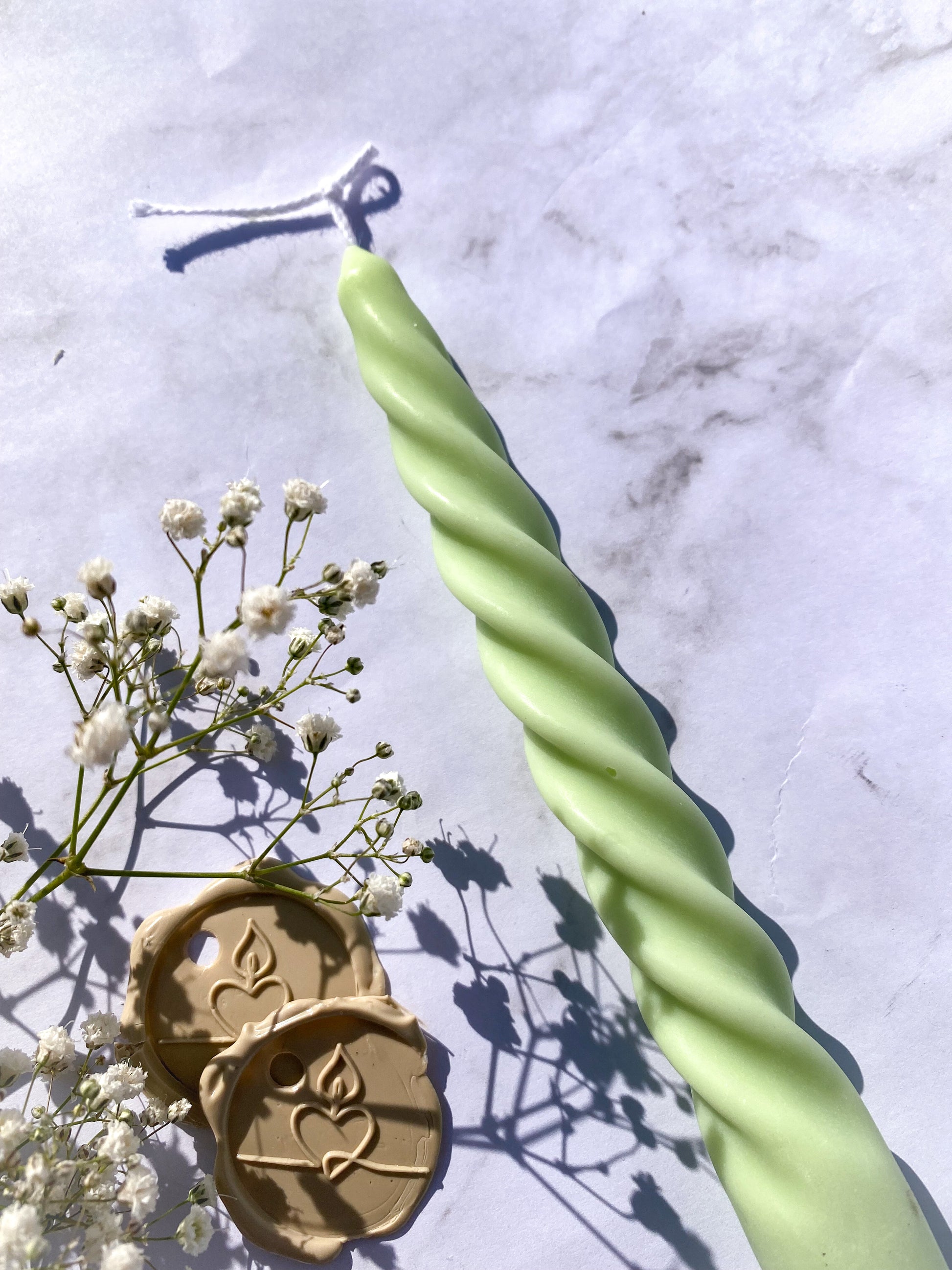 De getwiste kaars is gemaakt van pure koolzaadwas en waarvan de lont is gemaakt van katoen.
