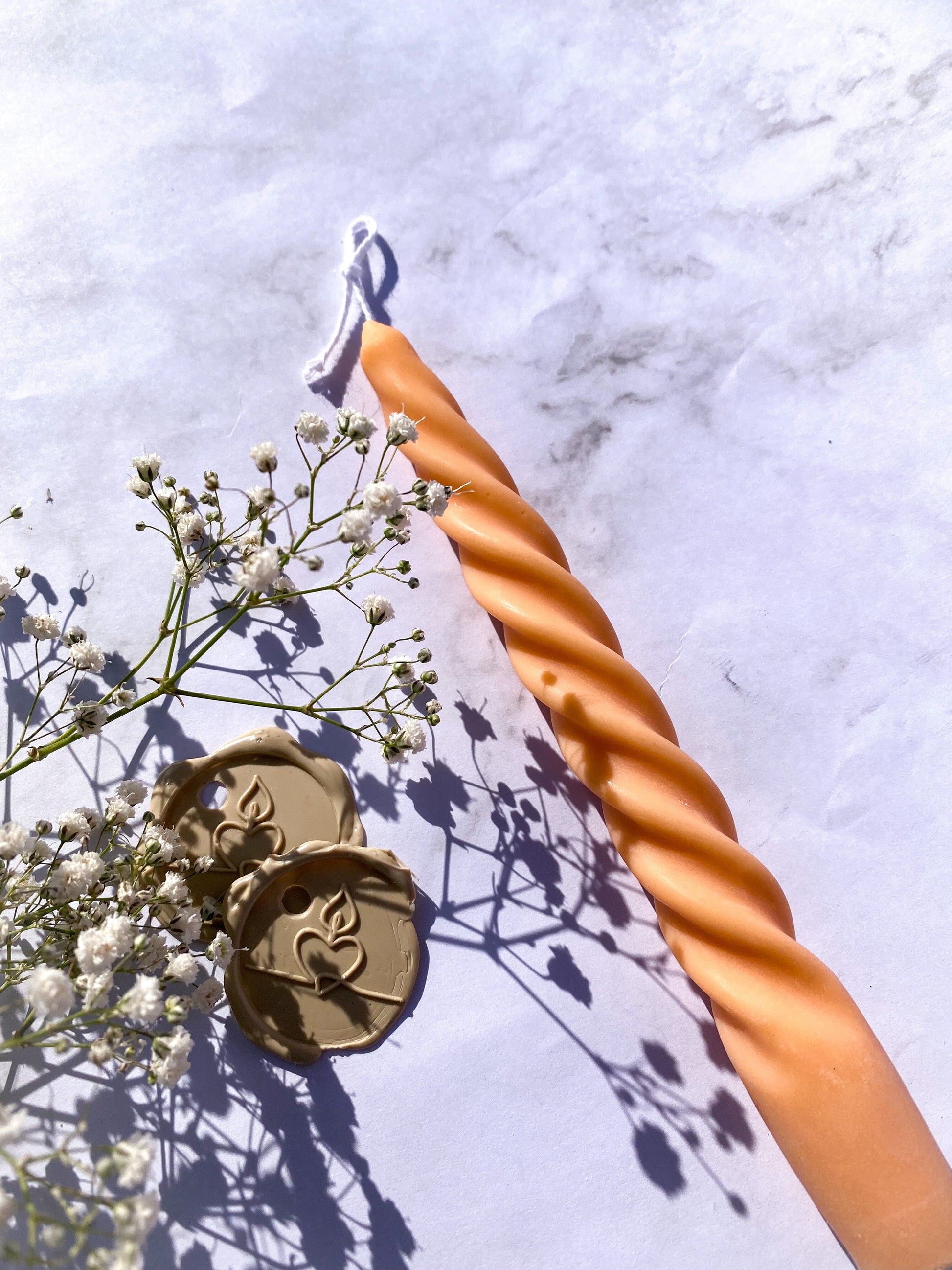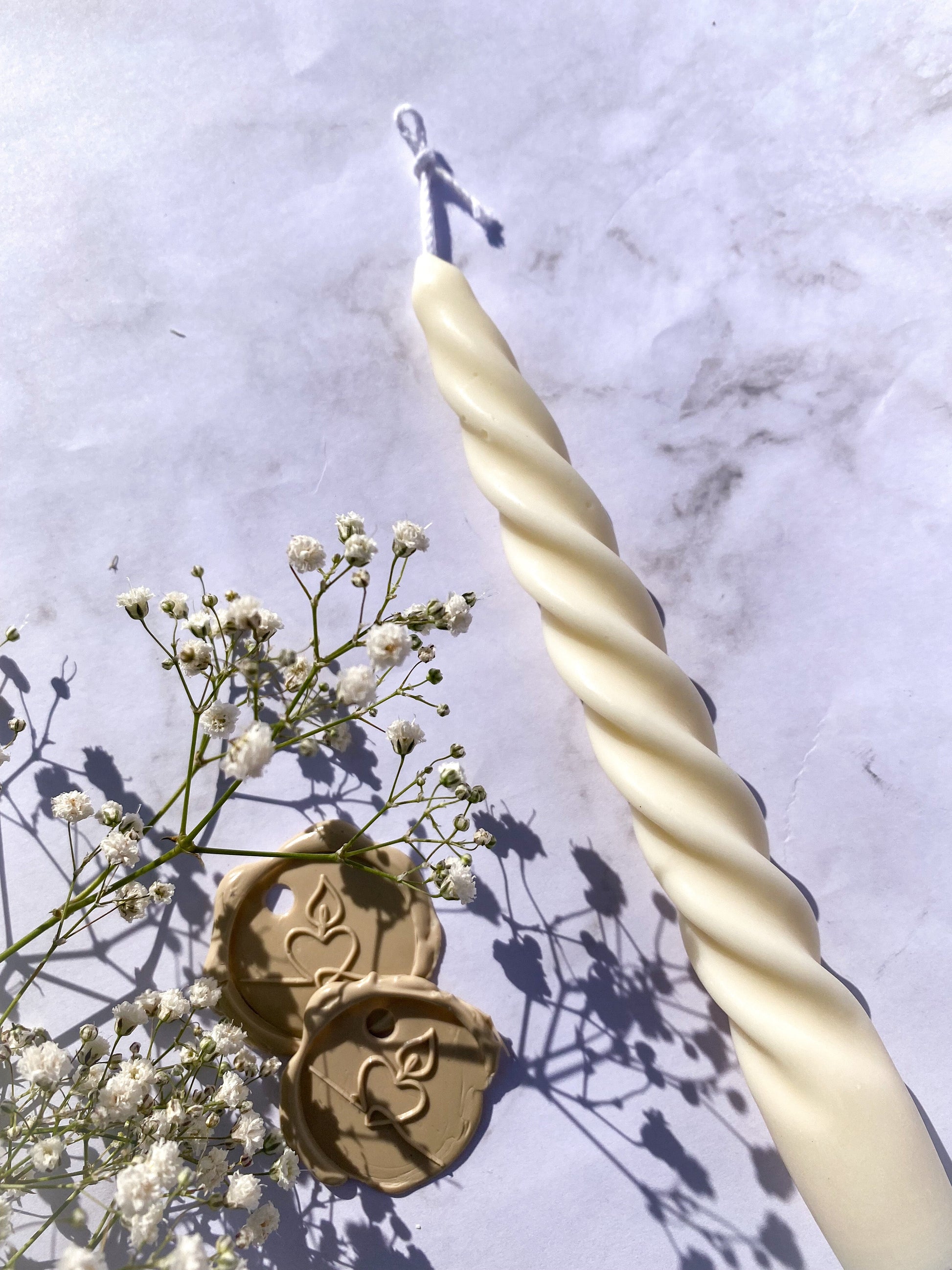 De getwiste kaars is gemaakt van pure koolzaadwas en waarvan de lont is gemaakt van katoen.